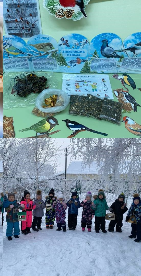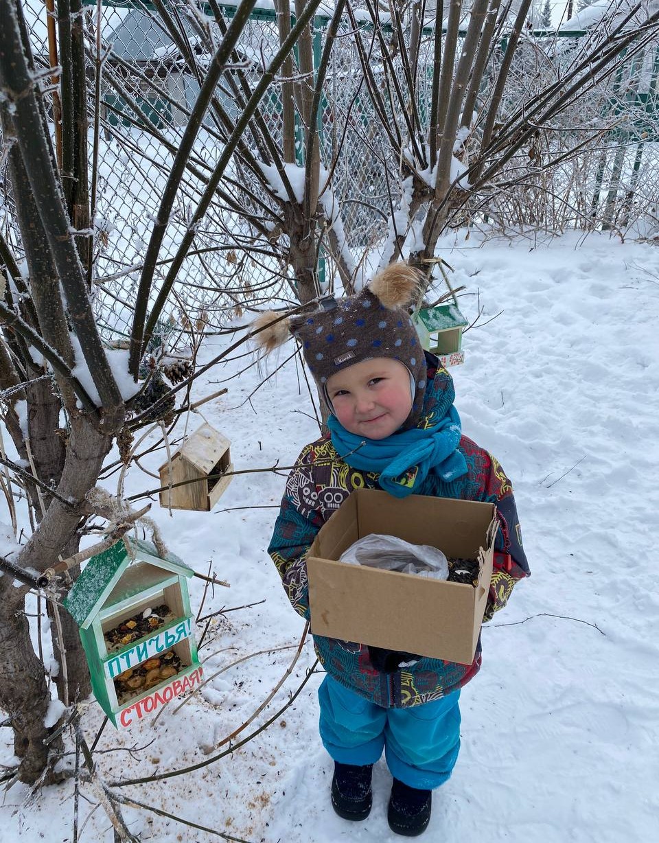 В нашем детском саду стало доброй традицией с наступлением холодов подкармливать пернатых друзей. И этой зимой мы не остались в стороне. Воспитанники средней группы совместно с родителями и педагогами Артеевой В. Т. и Тарабриной Н. А. приняли участие в экологической акции «Покормите птиц зимой». Дома родители с детьми смастерили различные кормушки, в том числе и съедобные. Кормушки были развешаны на территории детского сада. Семечки, сухофрукты, орехи, крошки хлеба, зерно, пшено – вот меню, которое предложили для птиц ребята. И теперь, в «птичьей столовой» не умолкает веселый щебет. Дети с удовольствием подкармливают пернатых, проявляют тем самым не только заботу, но и расширяют свои знания о повадках птиц, особенностях их внешнего вида, испытывают радость от сознания, что спасают птиц от гибели. И от этого может быть больше станет звонкого пения у наших домов, а мир, в котором мы живем чуть лучше.