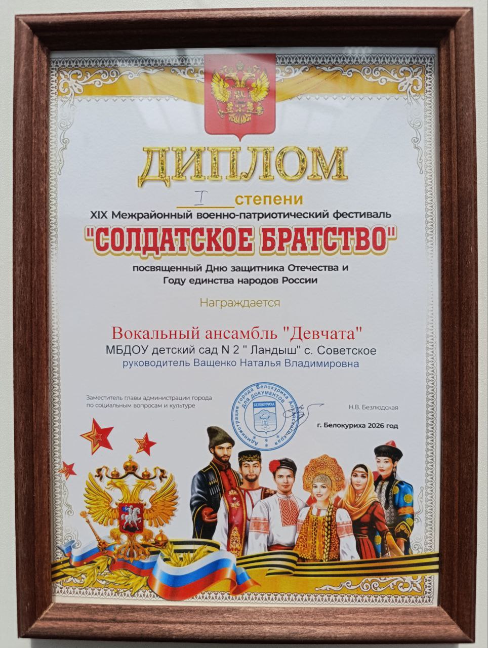Воспитанники подготовительной группы приняли участие в XIX Межрайонном военно-патриотическом фестивале «Солдатское братство», посвященному Дню защитника Отечества и Году единства народов России. Организаторы конкурса: Администрация города Белокуриха и МБУ «Центр культуры города Белокуриха». Цели и задачи конкурса: