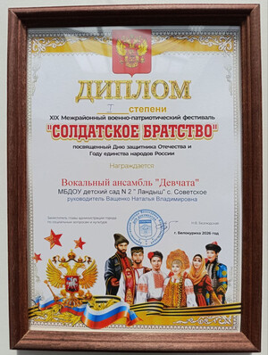 Участники фестиваля исполняли военно-патриотические стихи, песни о войне, родном крае, о Родине. Наш ДОУ на фестивале представлял вокальный ансамбль "Девчата" в составе: Каньшиной Дарины, Каньшиной Дарьи, Бражниковой Елизаветы, Долгановой Марии, Коршуновой Виктории, Кайзер Ангелины, Космыниной Валерии, музыкальный руководитель Ващенко Наталья Владимировна. В номинации «Вокал (ансамбль)» дошкольная возрастная категория – до 7 лет наш вокальный ансамбль, исполнивший песню «Солдатики» стал обладателем Диплома I степени. Поздравляем участников фестиваля с победой!!!!! Администрация ДОУ выражает благодарность родителям юных дарований за поддержку и сотрудничество!